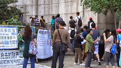 今天,有西安訪民,來打探加入聯合國上訪隊伍……。現在是暑假期間,學生集體出國旅遊的非常多。每天我們接待的大批大批的來之世界各國的學生團隊。今天在我們橫幅展架前停下的是一批中國學生,我們大家趕緊上前發傳單,有很多孩子不敢要,也有的孩子想要卻又將眼睛瞟著他們的帶隊的,很膽怯、恐懼的不敢拿。也有的孩子偷偷用相機或手機對我們的展福進行拍照但不敢與我們搭話,從他們的表情上可以看出,對我們在國內所遭受的迫害的確信與認同,也許在他們的家人,身邊的親戚、朋友、鄰居及街坊等人,發生過和我們同樣的被強拆或因動遷被逼家破人亡等……!但這些孩子很幸運的來到自由民主的美國旅遊,親眼所見自由世界的人民所享受的公民權利。最讓人難過的是那些還仍然在國內擺脫不了被中共蒙騙的,那種有冤不敢說,不敢申的膽怯、恐懼心裏的孩子們,他們什麽時候才能知道自己應享有的權利……!